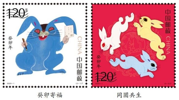 王静认为,《癸卯年》邮票中第一枚的蓝色兔子谐音“蓝图”。它透着天真与诚挚,又带着孩子般的放松与“不功利”。兔子一手执笔一手拿信,这封信或许是一位百岁老人在新年之际给所有人的祝福。第二枚邮票分为两个部分,一是前景的三只兔子,首尾相接,奔跑不息,像是连绵不绝的幸福。三只兔子的颜色冷暖对比,给人强烈的视觉冲击。背景中是用线条表现玉兔捣药形象。在古代皇帝的龙袍之上,左肩为日,右肩为月,月中就是玉兔捣药图案。中国人自古对月就有深重的情结。古人以月亮潮汐记录时间,指导农耕。月亮不仅是神秘的传说,是诗意,更是人们赖以生活的符号。