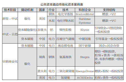 在颠覆性碳中和技术领域,国际国内都已出现由公共资本撬动市场化资本的案例。本文梳理了几个代表性案例,将其干预阶段、撬动机制与支持结构解析如下(见表):