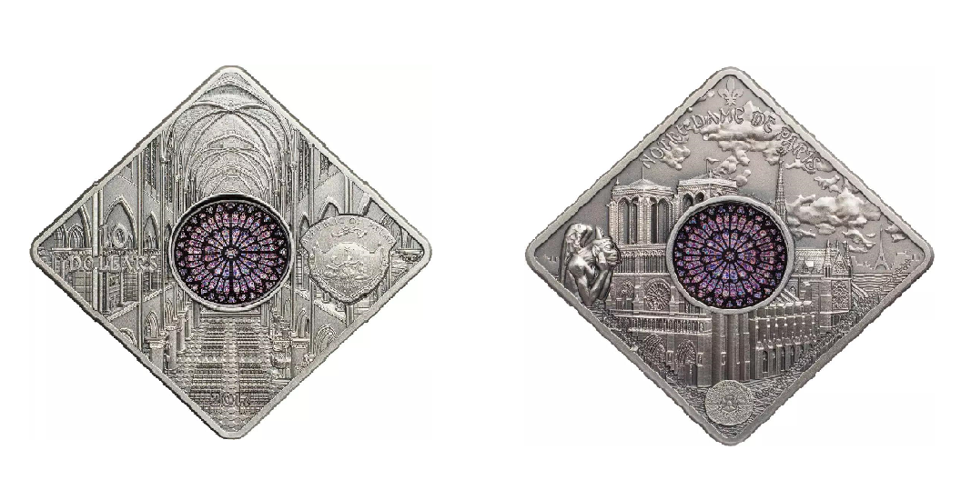 大火后的巴黎圣母院,能以另一种方式留下来。2011年,库克群岛发行了巴黎圣母院玫瑰花窗玻璃镶嵌银币,帕劳在2017年发行了圣殿之窗系列巴黎圣母院菱形镶嵌银币。它们均采用了镶嵌工艺,不同的是,后者还采用了仿旧工艺处理,正背面结合了巴黎圣母院的外景和内部建筑特点,更显历史厚重感。