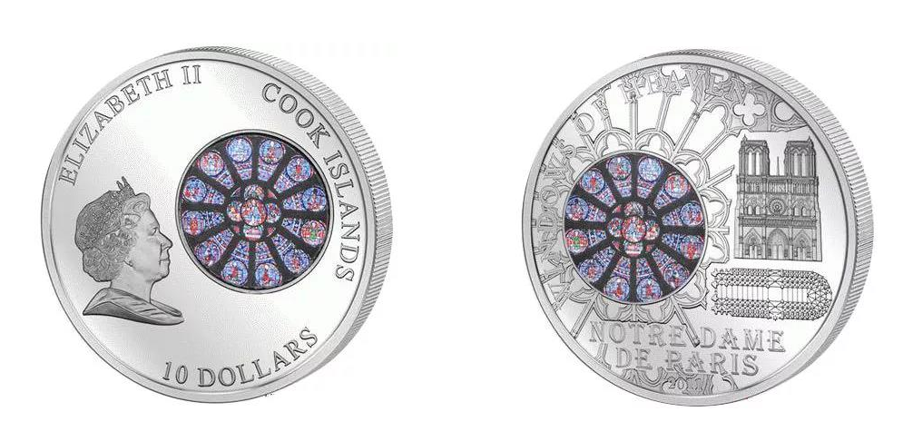 库克群岛2011年巴黎圣母院玫瑰花窗玻璃镶嵌银币