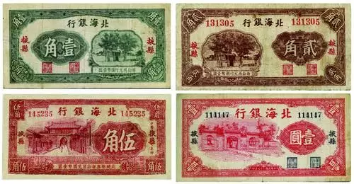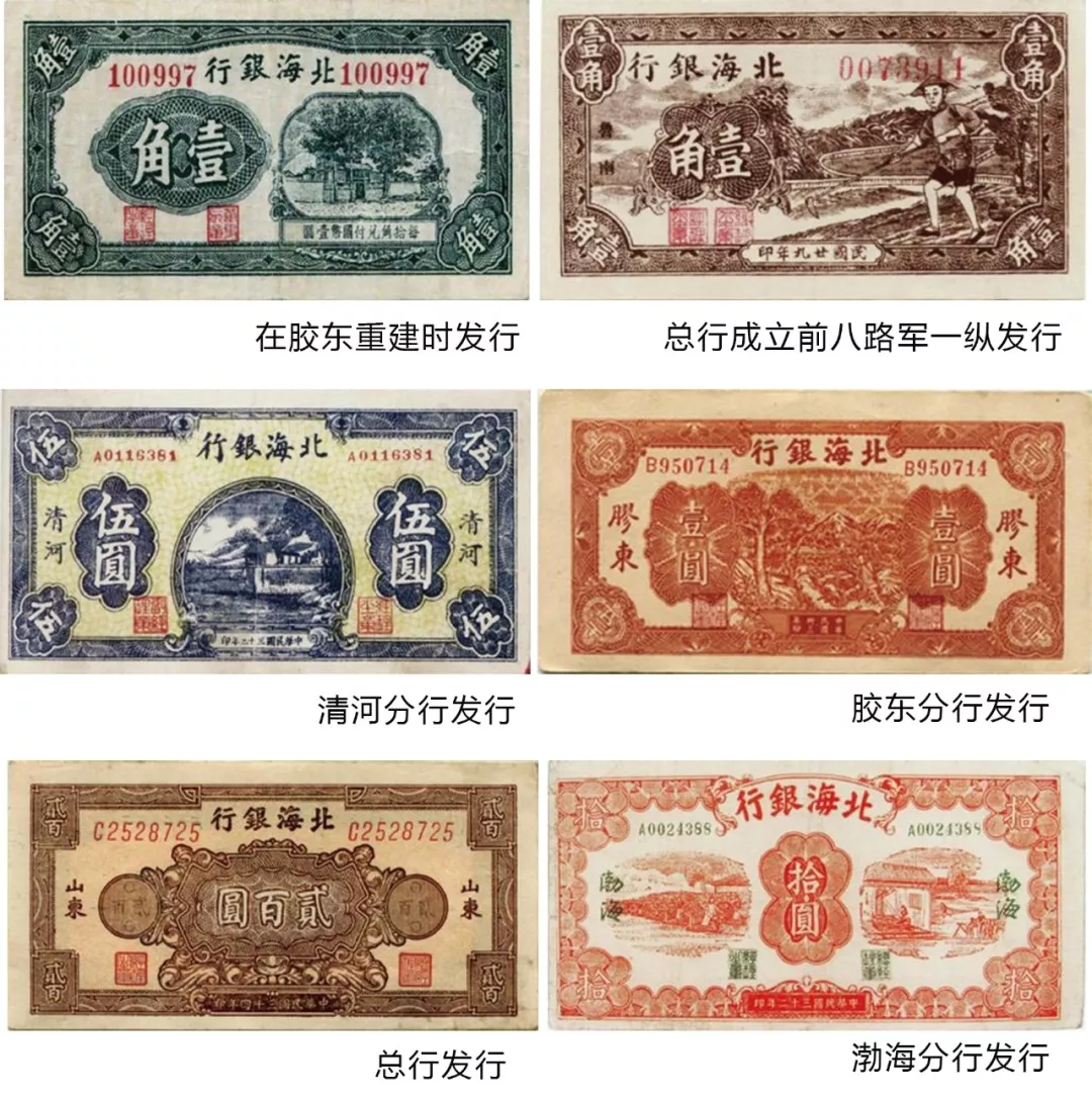 北海币发行概况。1938年12月1日,北海银行在掖县成立时,发行了1元、5角、2角、1角四种面额的北海币。初次印发95000元,在蓬黄掖3县流通。自1938年北海币初次发行至1949年停止发行,除北海银行总行外,八路军第一纵队、胶东分行、清河分行、冀鲁边分行、滨海分行、鲁中分行、鲁南分行以及渤海分行均发行过北海币,共有5分、1角、2角、2角5分、5角、1元、2元、5元、10元、25元、50元、100元、200元、500元、1000元、2000元16种面额,发行总量达7892亿元(参见《北海银行历年发行货币额统计表》)。除北海币,北海银行还发行过本票,面额包括25元、50元、100元、500元、1000元。1948年还在济南、潍坊、周村、烟台、益都等新解放城市发行过面额为10万元的本票。