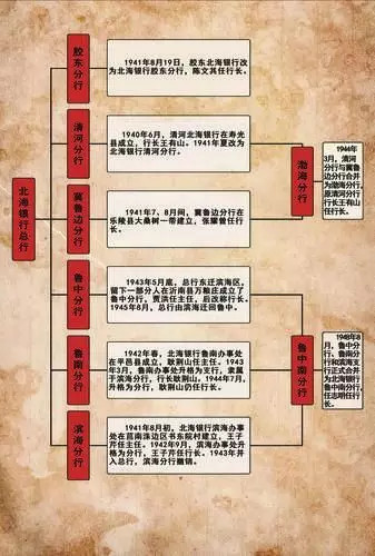 总行及分支行的建立与发展。1940年10月,山东省战时工作推行委员会(以下简称省战工会)在临沂沂南县青驼寺成立北海银行总行,财政处长艾楚南兼任行长。总行建立后,胶东北海银行改称胶东分行,清河北海银行改称清河分行。1941年7月,建立冀鲁边区分行和滨海办事处。1942年初,北海银行总行移驻沂南县万粮庄。同年春,建立鲁南办事处;9月,滨海办事处改为分行。1943年3月,鲁南办事处改为支行,隶属滨海分行。至此,各分行大都在专署一级设支行,重点县设办事处或贷款所。