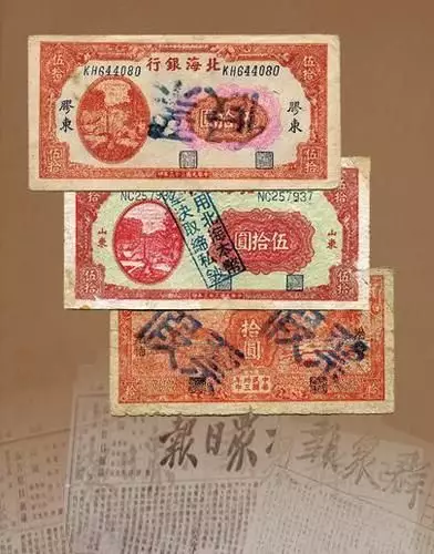 排法货币斗争。太平洋战争爆发后,日伪从占领区内向外排挤法币,并且伪造20多种法币,连同周围沦陷区的法币,大量涌入山东根据地造成严重通货膨胀。为限制法币流入和物资流出,1942年5月中共山东分局决定自7月1日起以北海币为山东根据地的本位币,法币由折价使用到逐步停用,使北海币脱离法币。1943年上半年,胶东区和鲁中的沂蒙区相继停用法币成功。但此时货币斗争尚未成功的地区,通胀并未消除。由此造成了北海币在不同地区币值不一。为此,1943年夏,北海币改为分区发行,票面加印“滨海”、“鲁南”、“鲁中”、“胶东”、“渤海”字样,分区流通。