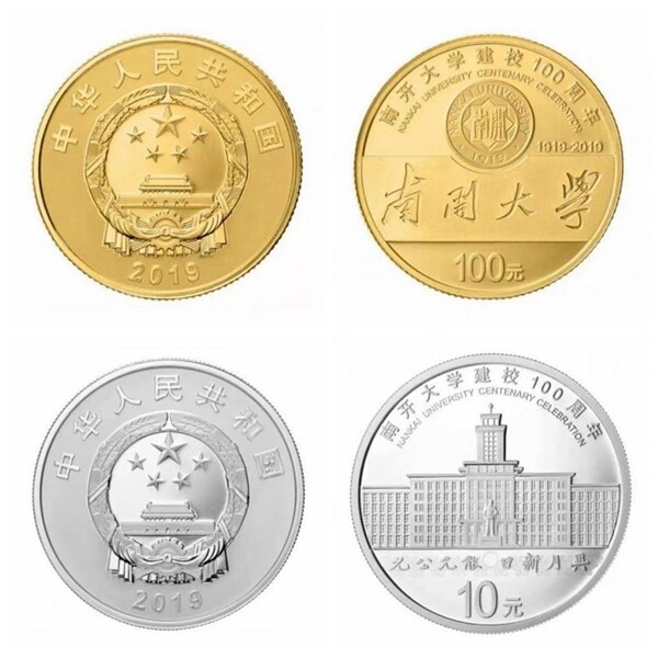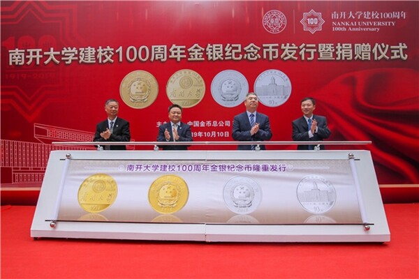 为纪念南开大学成立百年,10月10日,中国人民银行发行南开大学建校100周年金银纪念币。当日,该套纪念币发行暨捐赠仪式在南开大学八里台校区冰海楼前举行。南开大学副校长李靖、中国人民银行货币金银局副局长李会锋、中国金币总公司总经理井军、中国人民银行天津分行副行长王晓明出席仪式并共同为南开大学建校100周年金银纪念币揭幕,中国金币总公司副总经理邵军志代表中国金币总公司向南开大学捐赠南开大学建校100周年金银纪念币一套。